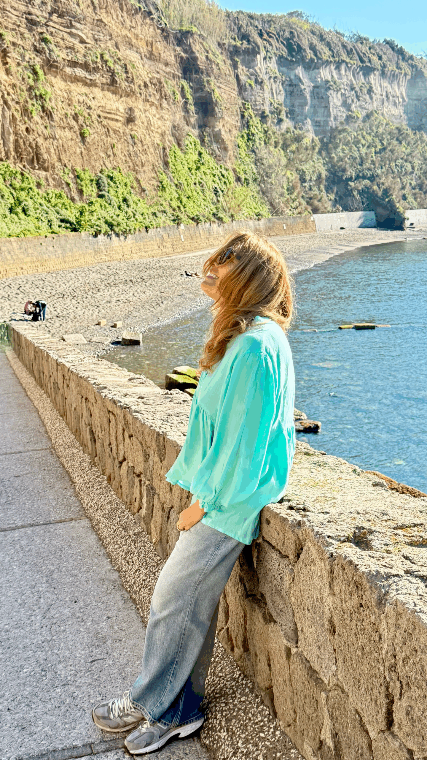 Linbluse med voluminøse puffermer som faller veldig pent..